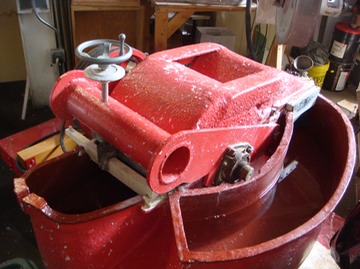 A 3lb. beater, originally a test machine for the commercial paper industry, via Iowa. For some reason, the deep millrace / tub is bisected by the pie slice you see; the pulp circulates through a channel underneath it. I didn't use this particular machine, but it is already in frequent use. It's a strong workhorse with a huge roll and bedplate.