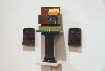 Inset concertina text of color photocopied dictionary definitions of the word 'book' mounted to Rives BFK Heavy paper; opening the lid to read activates the AM radio, set at top volume to the most obnoxious talk station available. Usually displayed next to the mural 'SILENCE'.