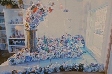 At William Busta Gallery, Cleveland Ohio, as a window installation during the exhibition Utopia Unrealized; end of the show's run.  The narcissus bulbs have flowered and then dropped their blooms.