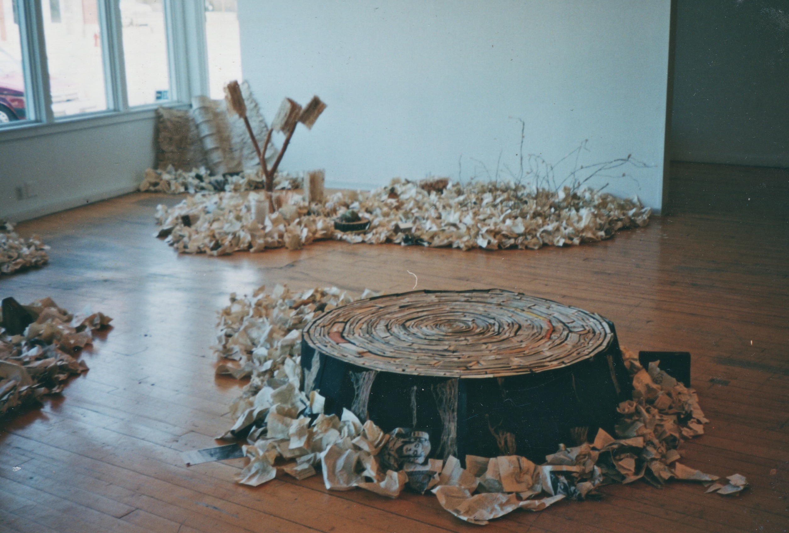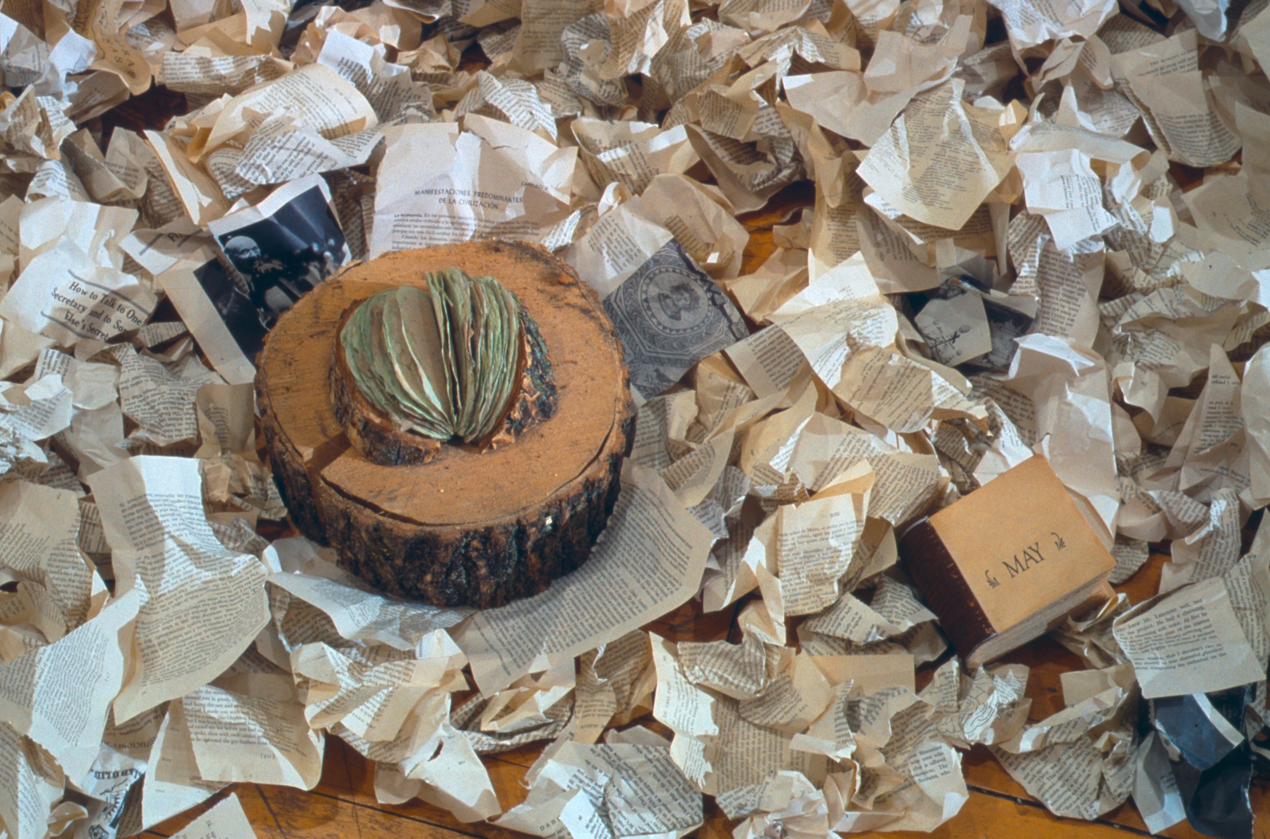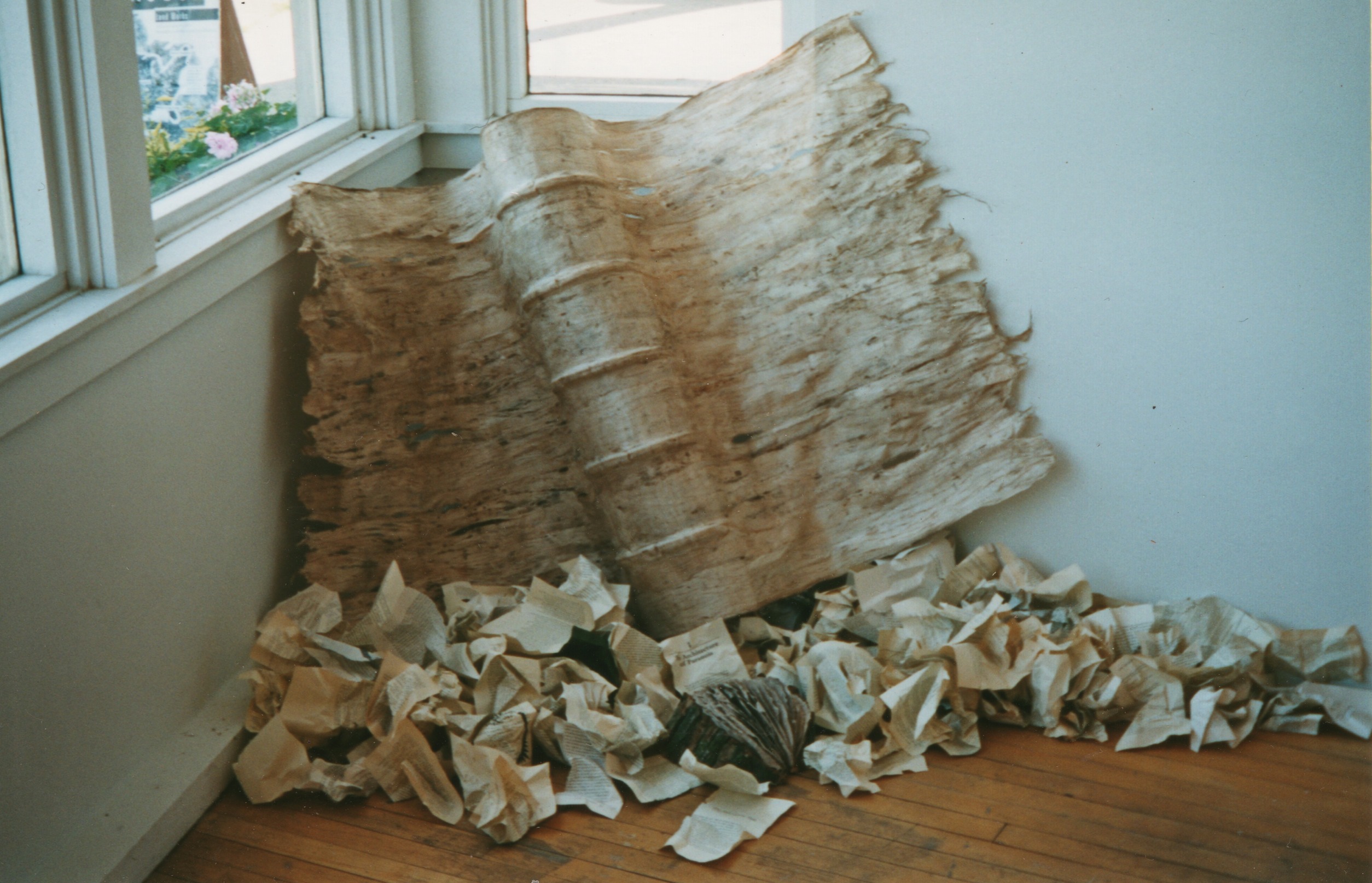 Speaking Volumes was created for an exhibition of installations titled Land Marks, at Spaces gallery in Cleveland, Ohio. It was a contemplative, fallow garden of early, empty kozo-fiber bookworks, mounds of shed book pages and rusted books; bits of found text and musical notations were strategically placed throughout. It was a bit of a risk because almost everything was below eye level, but I was pleased to see people sitting on the floor or the nearby bench to read, observe, or quietly absorb, as one might do in a real garden.