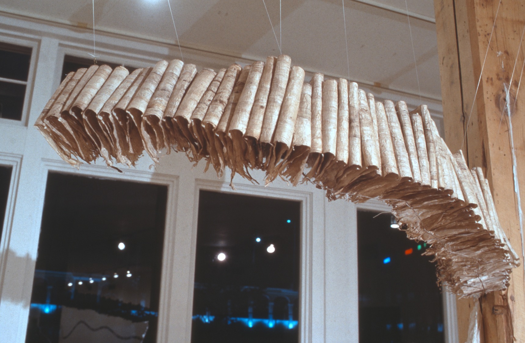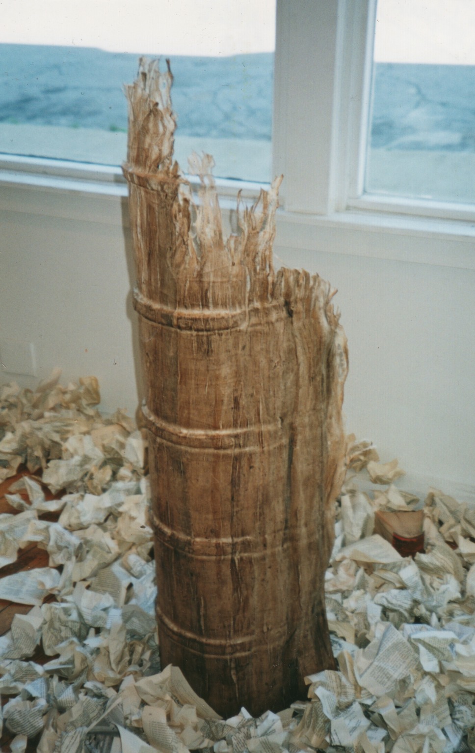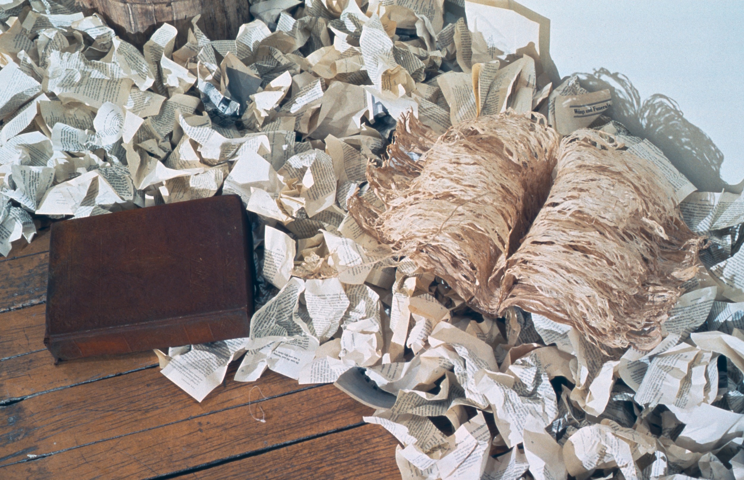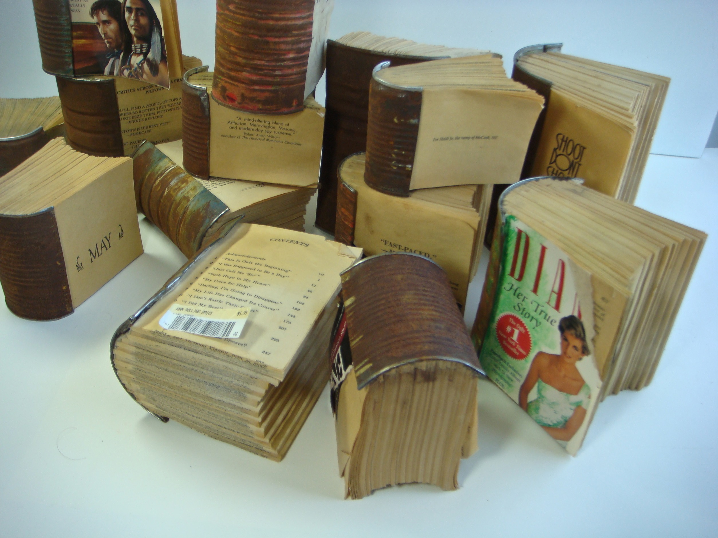 Speaking Volumes was created for an exhibition of installations titled Land Marks, at Spaces gallery in Cleveland, Ohio. It was a contemplative, fallow garden of early, empty kozo-fiber bookworks, mounds of shed book pages and rusted books; bits of found text and musical notations were strategically placed throughout. It was a bit of a risk because almost everything was below eye level, but I was pleased to see people sitting on the floor or the nearby bench to read, observe, or quietly absorb, as one might do in a real garden.