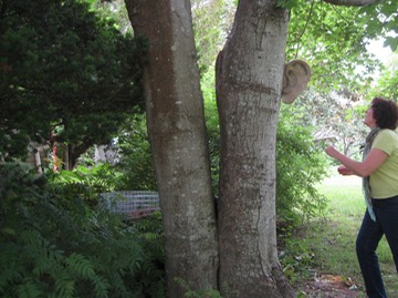 I had a limited amount of time on the Vineyard. The day we had slated for installation was very damp with intermittent drizzling and light rains, but there was no choice: we installed anyways. Sandy Bernat, my lovely, wonderful hostess (and the proprietor of Seastone Papers) accompanied me, helping, watching, laughing, documenting. We installed three more pieces on her lovely wooded, peaceful property. Since it is a privately-owned place, with many visitors but not usually open to the public, we installed mostly at eye level, on pathways leading to the studio.