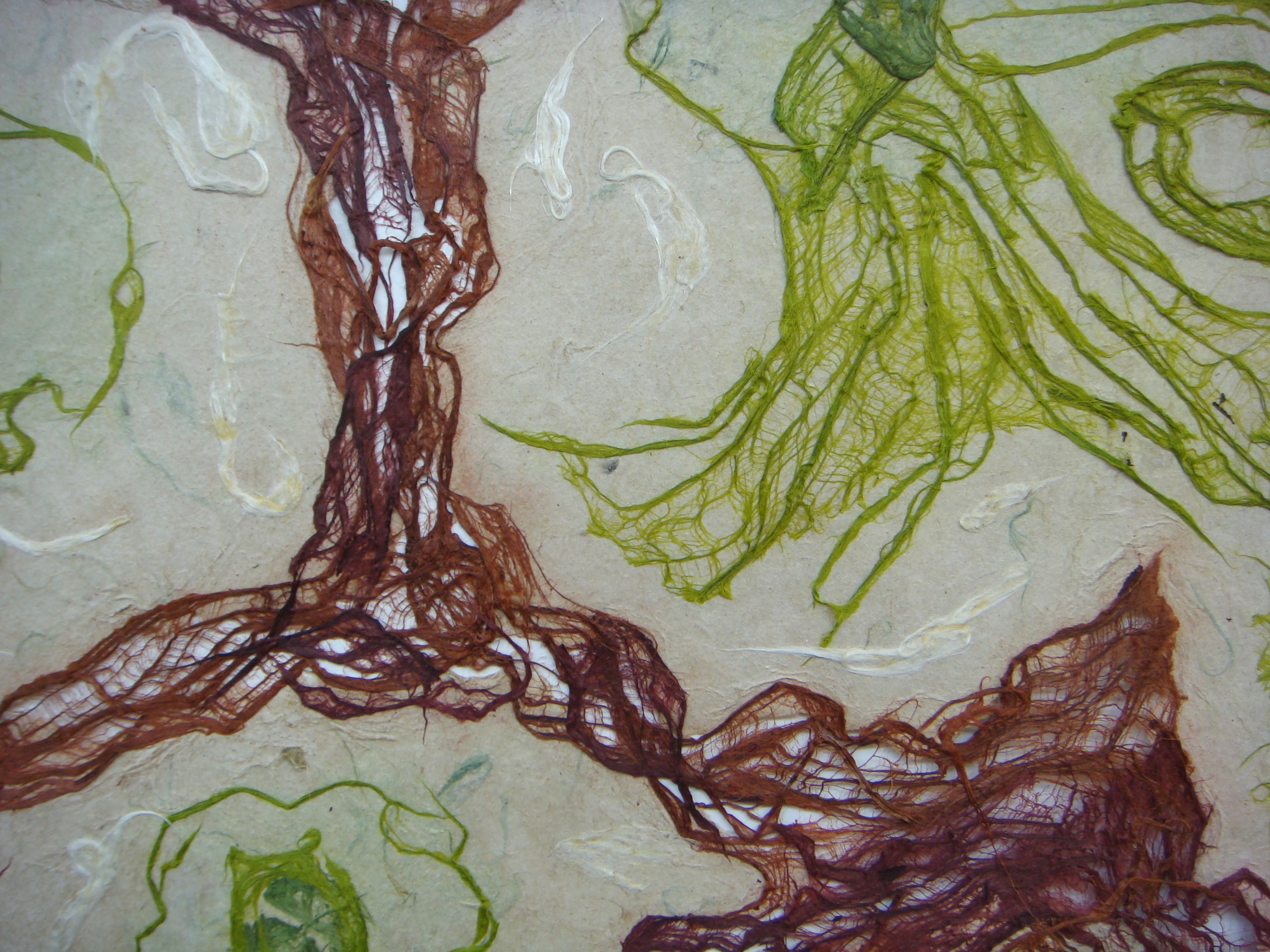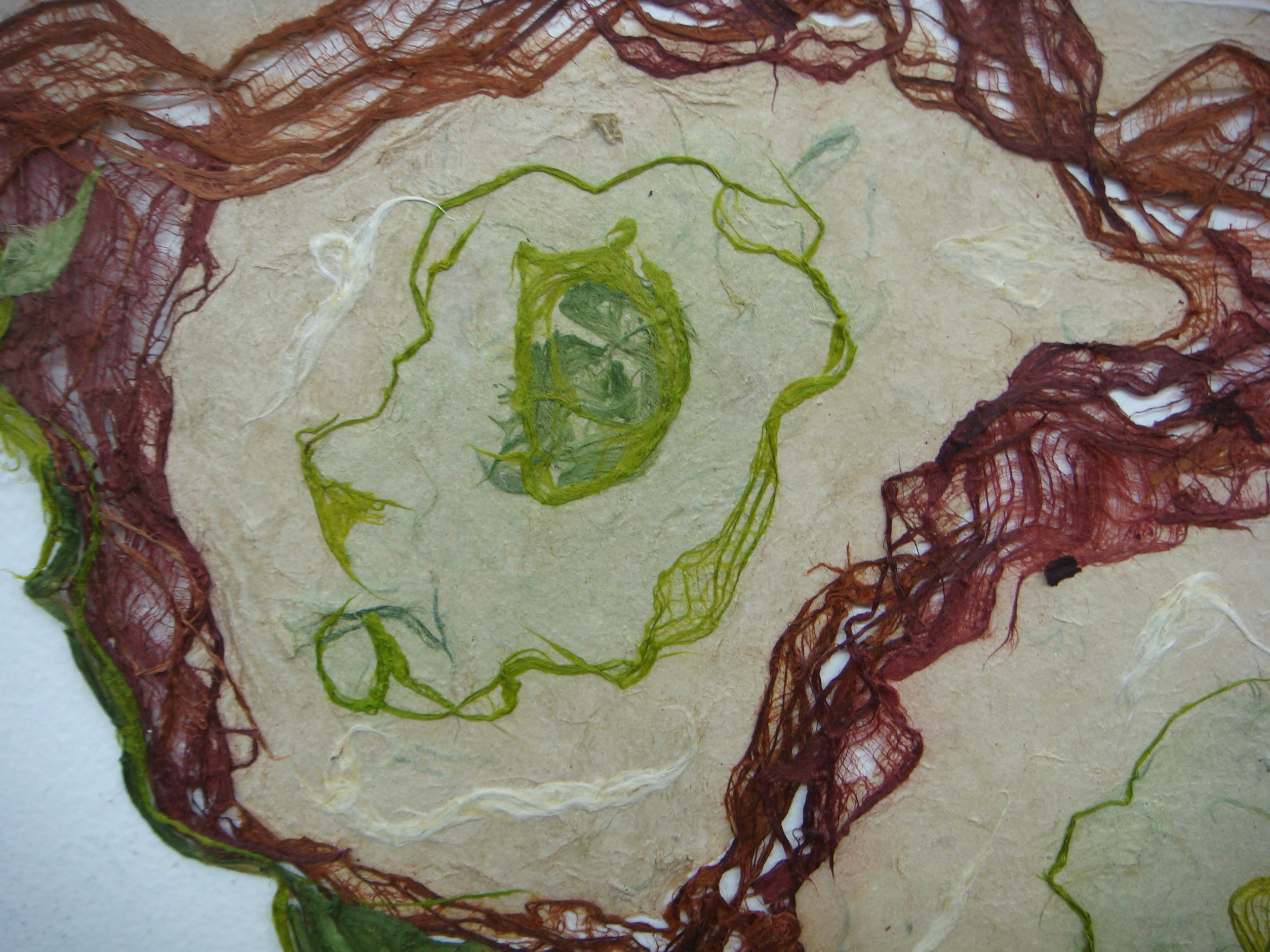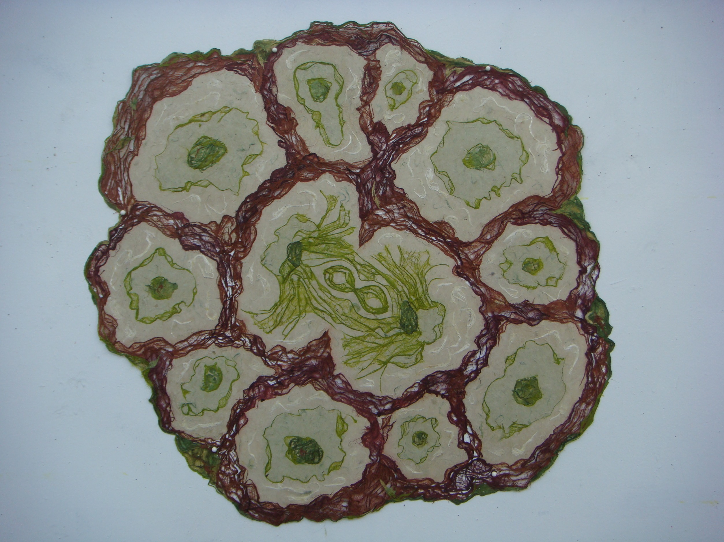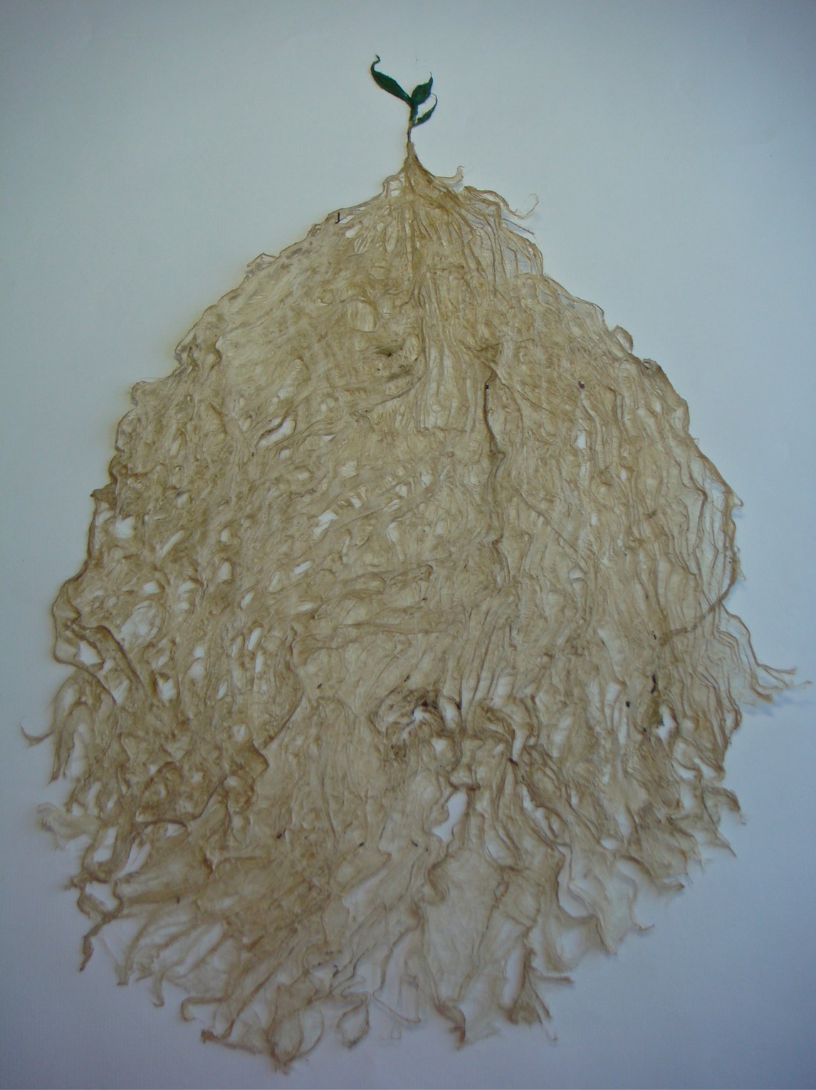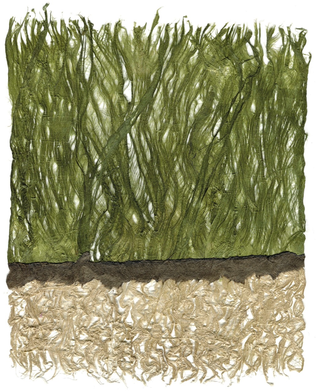 This 2D work isn’t, really. These are basically drawings made in any combination of bark and / or pulp and / or wet sheets. They are essentially heavy sheets of paper, textured, a low bas-relief. Root / Basis is the most textured, a cast piece of about 1” in depth.